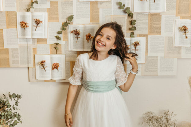 Cada niña vive la comunión de una manera única, y mi misión es que dentro de unos años podáis recordar cómo se sentía ese instante: los nervios, la ilusión y esa sonrisa que lo dice todo. En mi estudio de Cáceres, con luz suave y un espacio cuidado al máximo, retraté a Diana tal cual…